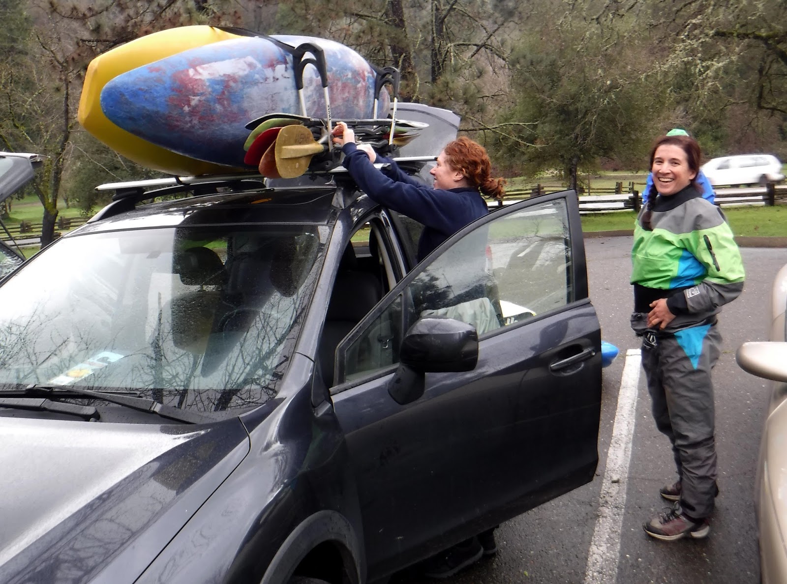 Meanwhile, just up the road at Marshall Gold Discovery Park, Melissa DeMarie and her group were dropping off vehicles and loading kayaks in the rain shower while getting ready to shuttle up to Chili Bar put in for one their group member's birthday paddle. Across the way, they could see the South Fork flowing fast and yellow tape blocking off piles of flood wreckage from the weeks before, heaped up along its banks.
